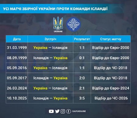 Двічі Україна з Ісландією з голами Владислава Ващука й Андрія Ярмоленка грала внічию – 1:1 та одного разу поступилася (0:2).