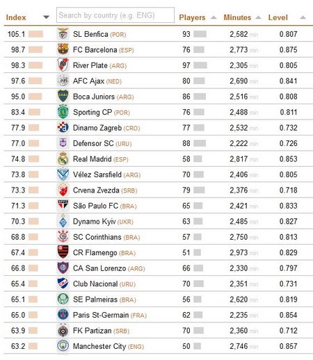 Як і минулого року, на першому місці знаходиться «Бенфіка» з 93 підготовленими гравцями, які виступають у 49 проаналізованих лігах, середнім рівнем клубів 0,81 і 2 582 хвилинами, проведеними в офіційних матчах протягом останнього року. «Барселона» (76 гравців, середній рівень клубу 0,87 і 2 773 хвилини) і «Рівер Плейт» (97 гравців, середній рівень 0,81 і 2 305 хвилин) закривають подіум клубів із найкращими академіями.