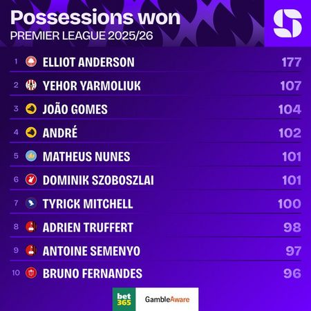 Гравці АПЛ із найбільшою кількістю виграних володінь м’ячем у сезоні-2025/26