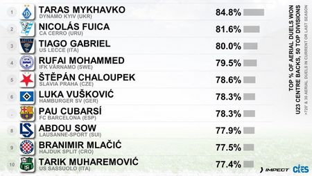 Перше місце посів захисник київського «Динамо» Тарас Михавко з показником 84.8% виграних дуелей у повітрі. Про це повідомляє CIES Football Obs в Х.