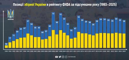 2025 рік збірна України завершила на 28-й позиції в рейтингу ФІФА. Учотирнадцяте поспіль наша національна команда розпочала новий рік у топ-50 підсумкового реєстру й увосьме поспіль – серед 30 найкращих збірних світу.