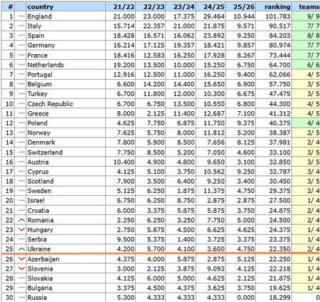 Таблиця коефіцієнтів УЄФА. Україна прогресує на дві позиції