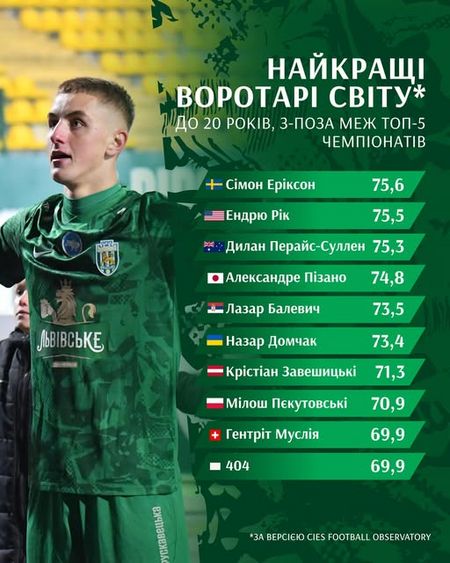 З індексом CIES 73,4 Назар став шостим серед голкіперів. Також він є лідером у цьому списку за показниками довгих пасів (Long passes) і захисних дій (Defensive Actions) та є другим за показниками сейвів, повідомляє прес-служба львівського клубу.