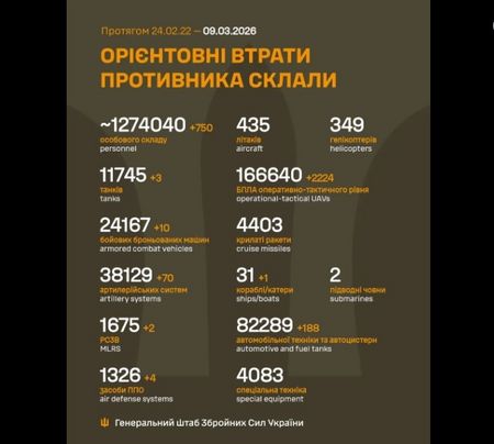 Оперативна інформація станом на 08:00 09.03.2026 щодо російського вторгнення