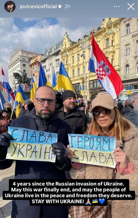 На фото Йовичевич разом із дружиною тримають плакати з написами «Слава Україні» та «Героям Слава».