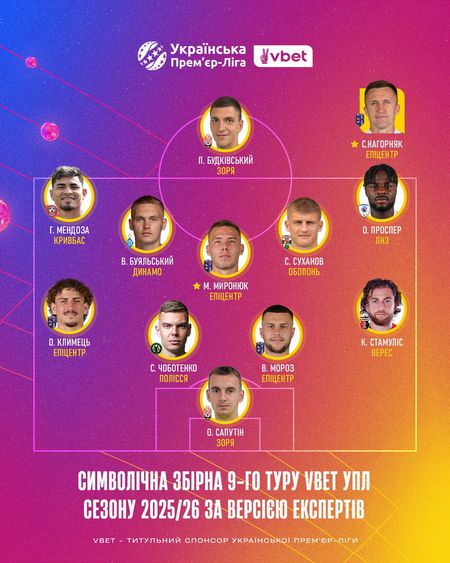 Українська Прем’єр-ліга продовжує відзначати героїв сезону-2025/26 і склала символічну збірну 9-го туру чемпіонату УПЛ, а також назвала найкращого гравця та найкращого тренера 9-го туру. Традиційно це було зроблено разом із ведучими, експертами, коментаторами УПЛ ТБ та представниками провідних спортивних ЗМІ України. Цього разу їх було 39.