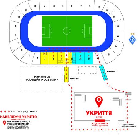 Укриття на випадок повітряної тривоги обладнане на території стадіону, під паркінгом. Воно має усе необхідне – питну воду, санвузли тощо.