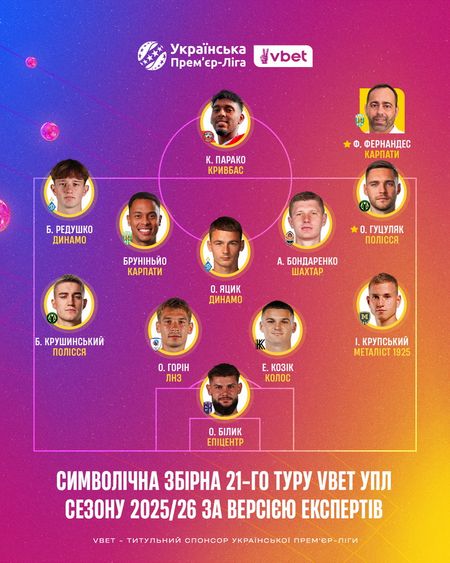 Українська Прем’єр-ліга продовжує відзначати героїв сезону-2025/26 і після того, як відбувся перенесений матч «Зоря» – «Шахтар», склала символічну збірну 21-го туру чемпіонату УПЛ, а також назвала найкращого футболіста та найкращого тренера 21-го туру. Традиційно це було зроблено разом з ведучими, експертами, коментаторами УПЛ.ТБ та представниками провідних спортивних ЗМІ України. Цього разу їх вийшло 33.