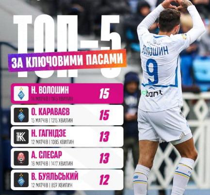 П’ятірку найкращих за кількістю ключових пасів очолили динамівці Назар Волошин та Олександр Караваєв. Ще один представник киян, капітан «біло-синіх» Віталій Буяльський, замкнув ростер, третє та четверте місця в якому посіли Ніка Гагнідзе («Колос») та Артем Слесар («Зоря»).