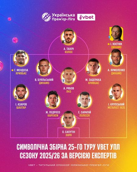 Українська Прем’єр-ліга продовжує відзначати героїв сезону-2025/26 і склала символічну збірну 25-го туру чемпіонату УПЛ, а також назвала найкращого футболіста та найкращого тренера 25-го туру.