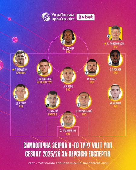Українська Прем’єр-ліга продовжує відзначати героїв сезону-2025/26 і склала символічну збірну 8-го туру чемпіонату УПЛ, а також назвала найкращого гравця та найкращого тренера 8-го туру. Традиційно це було зроблено разом з ведучими, експертами, коментаторами УПЛ ТБ та представниками провідних спортивних ЗМІ України. Цього разу їх було 38.